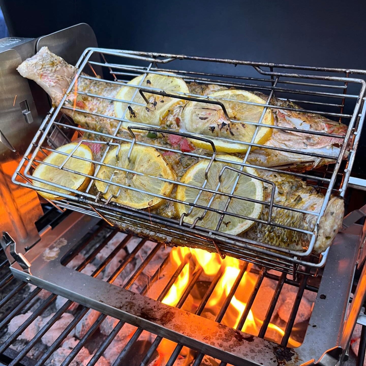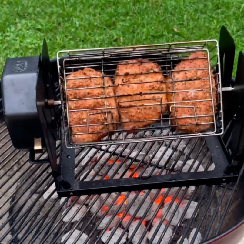 The Roto-Q 360™ Basic Set + FlatSpin Cage bundle is your go-to solution for perfectly cooked fish fillets, steaks, ribs, chicken thighs, and vegetables. The FlatSpin Cage holds your food securely, allowing the Roto-Q 360™ to rotate it evenly for up to 60 minutes — all without electricity, gas, or batteries.