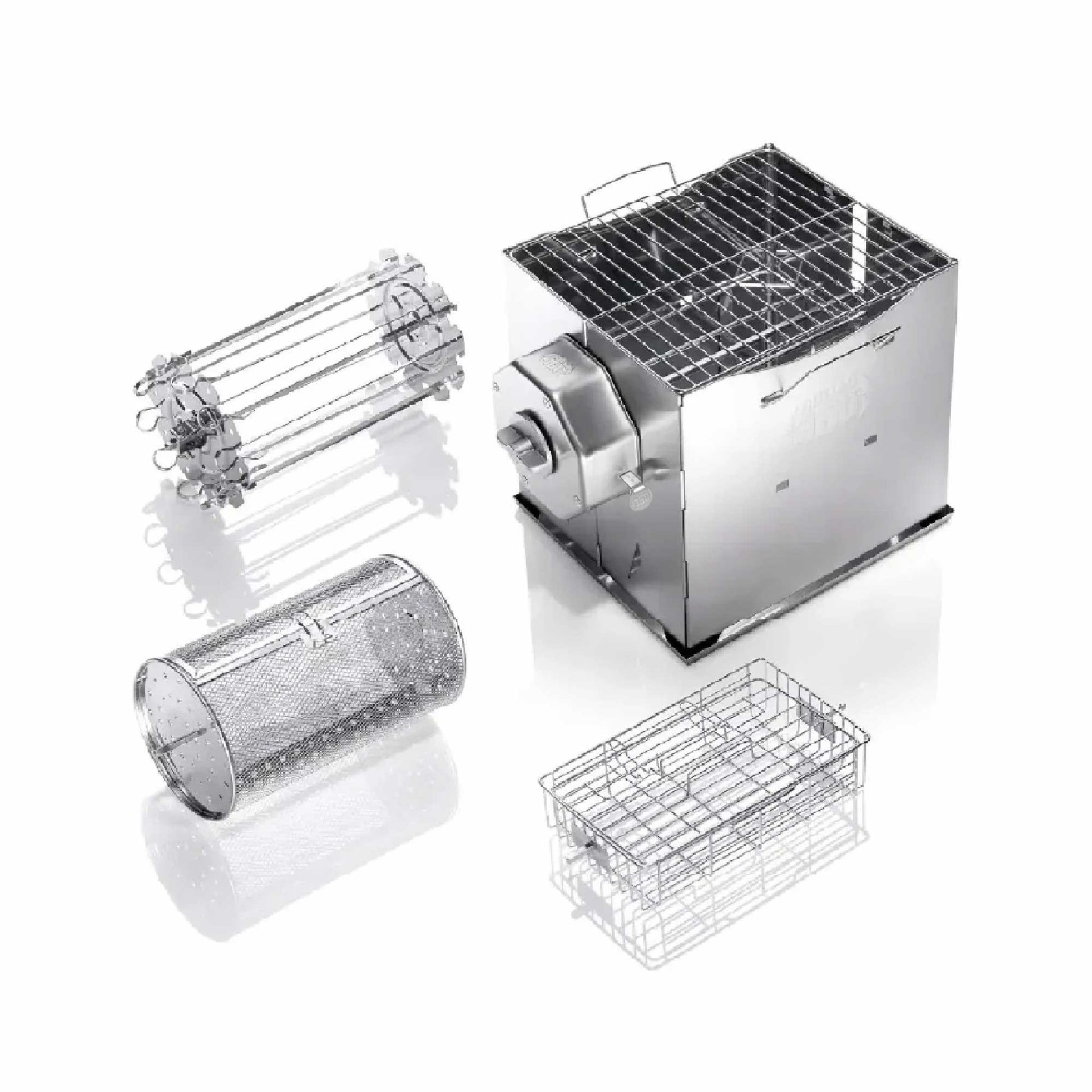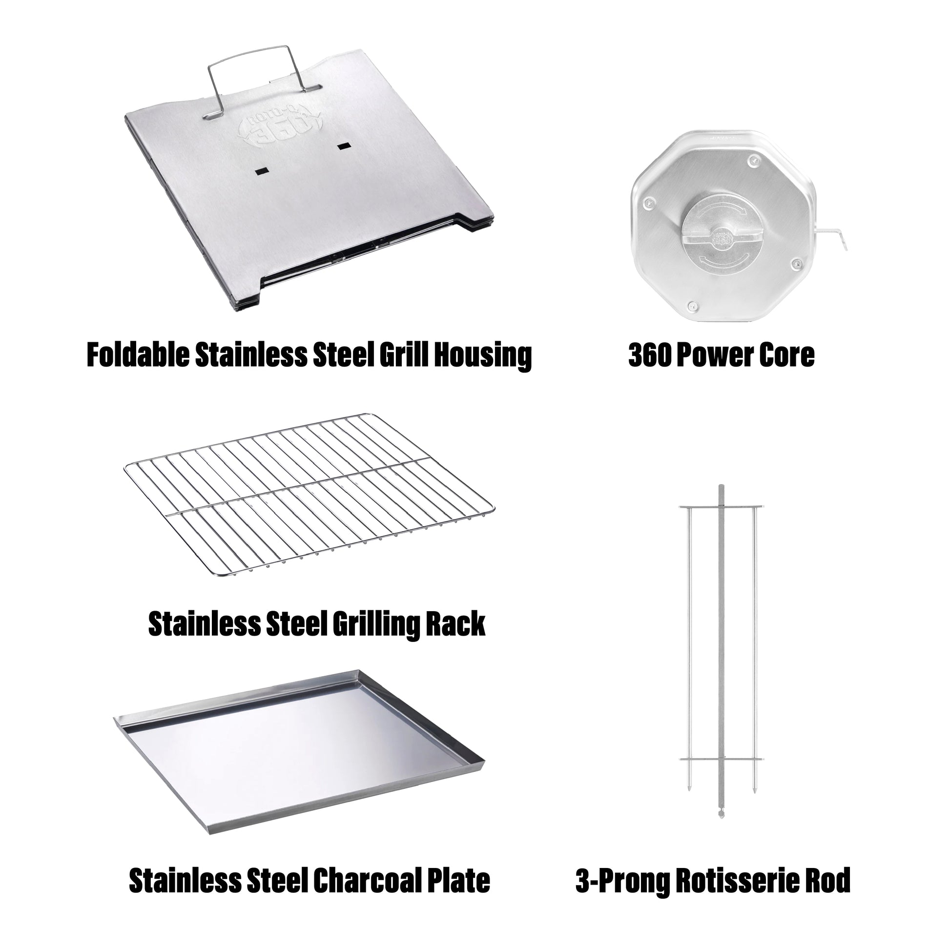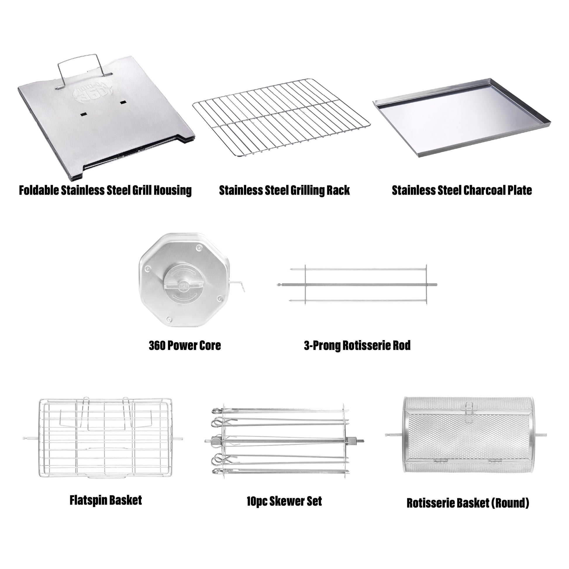 Take your outdoor cooking to the next level with this all-in-one, non-electric rotisserie bundle. The foldable stainless steel grill packs flat for easy transport and quick setup—perfect for camping, tailgating, picnics, or backyard BBQs. Powered by the 60-minute wind-up Power Core, it delivers even, hands-free rotation with no gas, batteries, or electricity. Complete with a Rotisserie Basket, Flatspin Cage, and 10-Piece Skewer Set, the ROTO-Q 360™ offers maximum versatility for wings, veggies, fish, meats, and kebabs—anytime, anywhere.